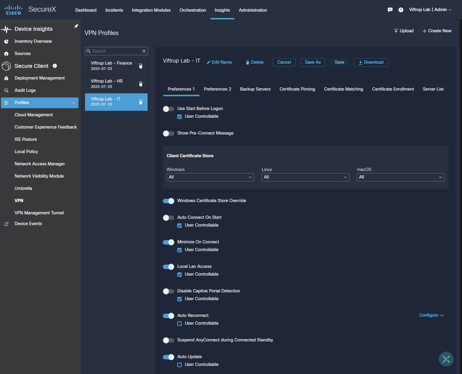 As previously mentioned, it is possible to control all the regular profiles within the SecureX platform, just like if you were to create a profile within an ASA, FTD, or through the VPN Profile Editor.