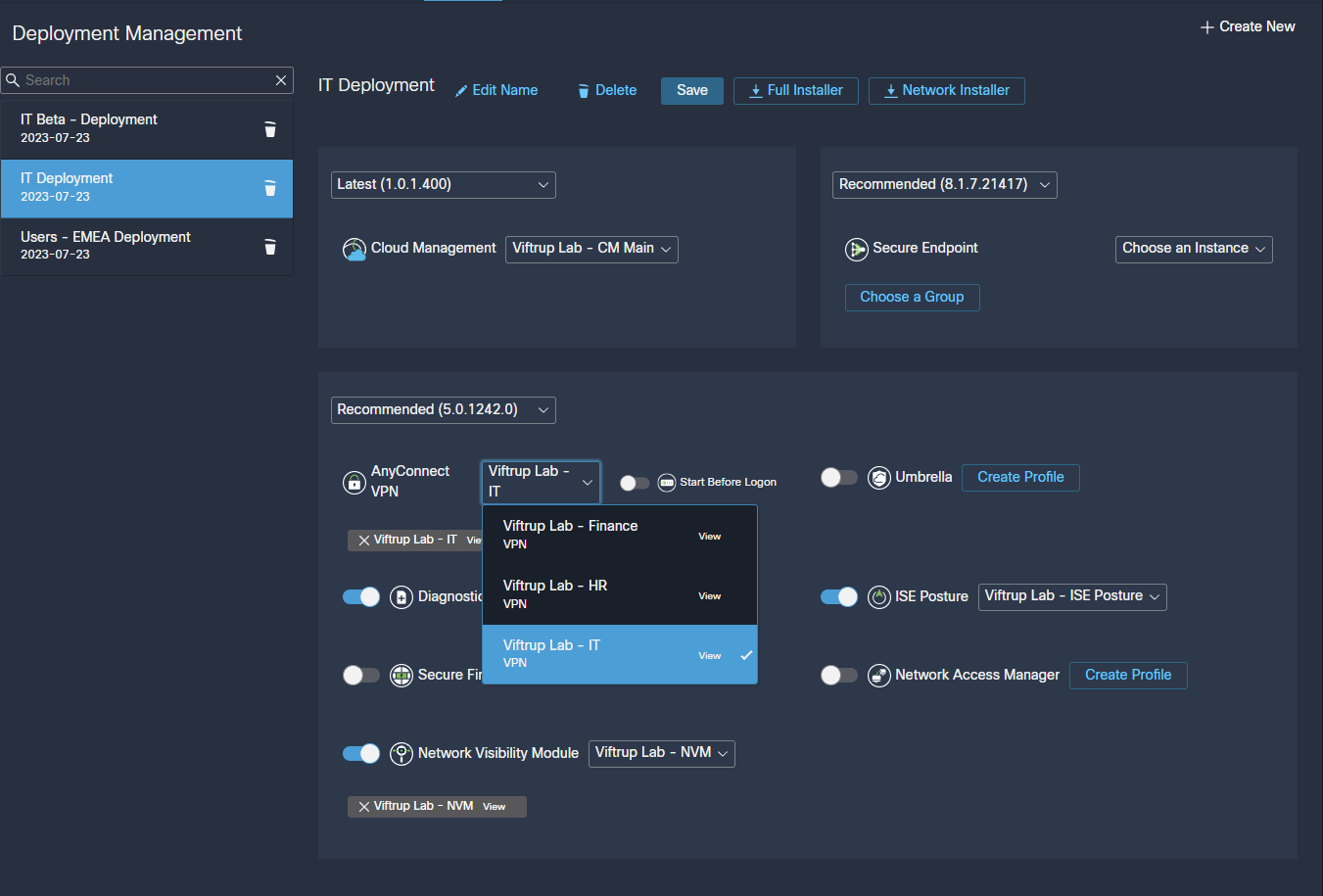 Once all necessary profiles have been created, the last step is to set up a deployment that will utilize the modules and created profiles depending on the deployment function.