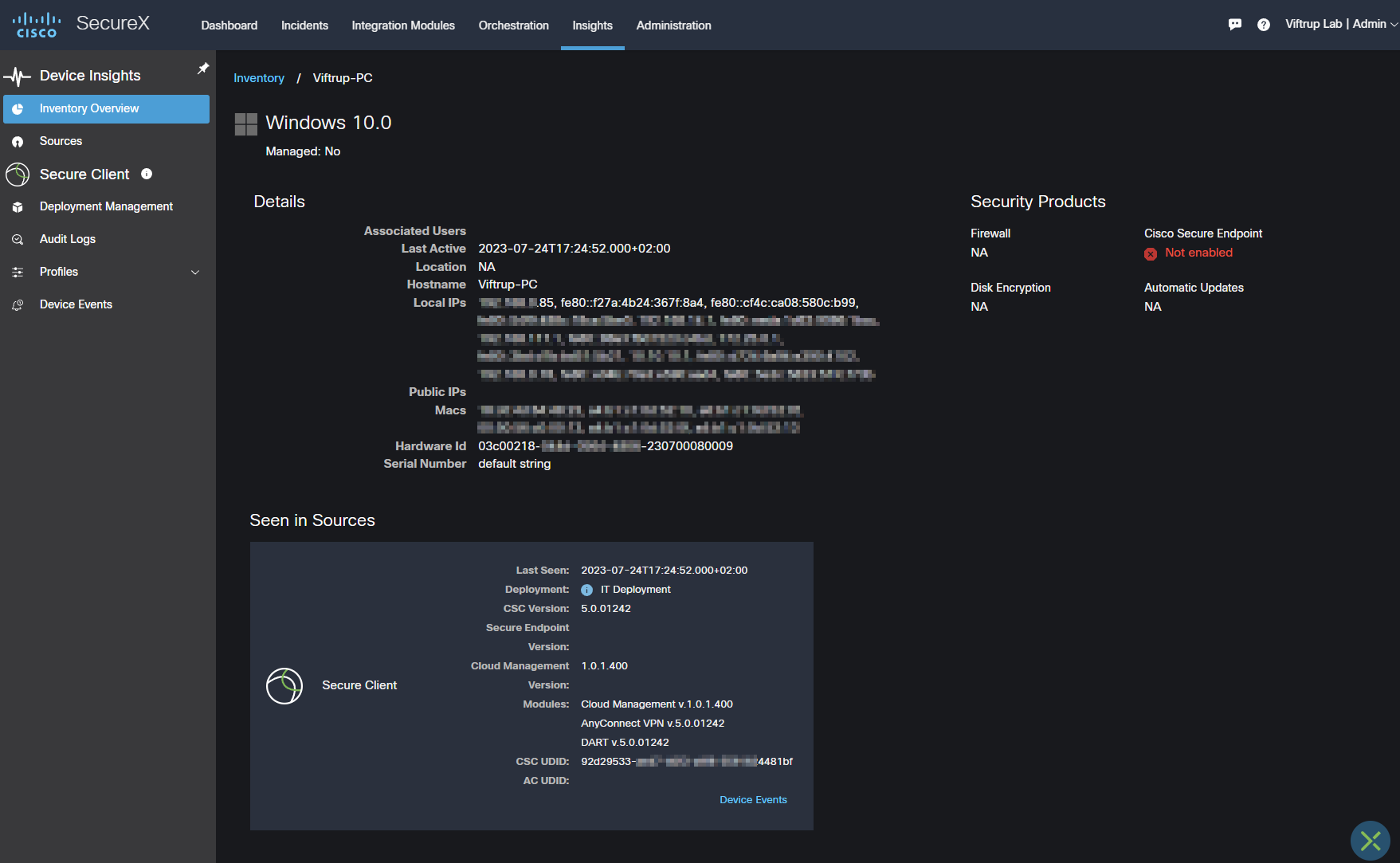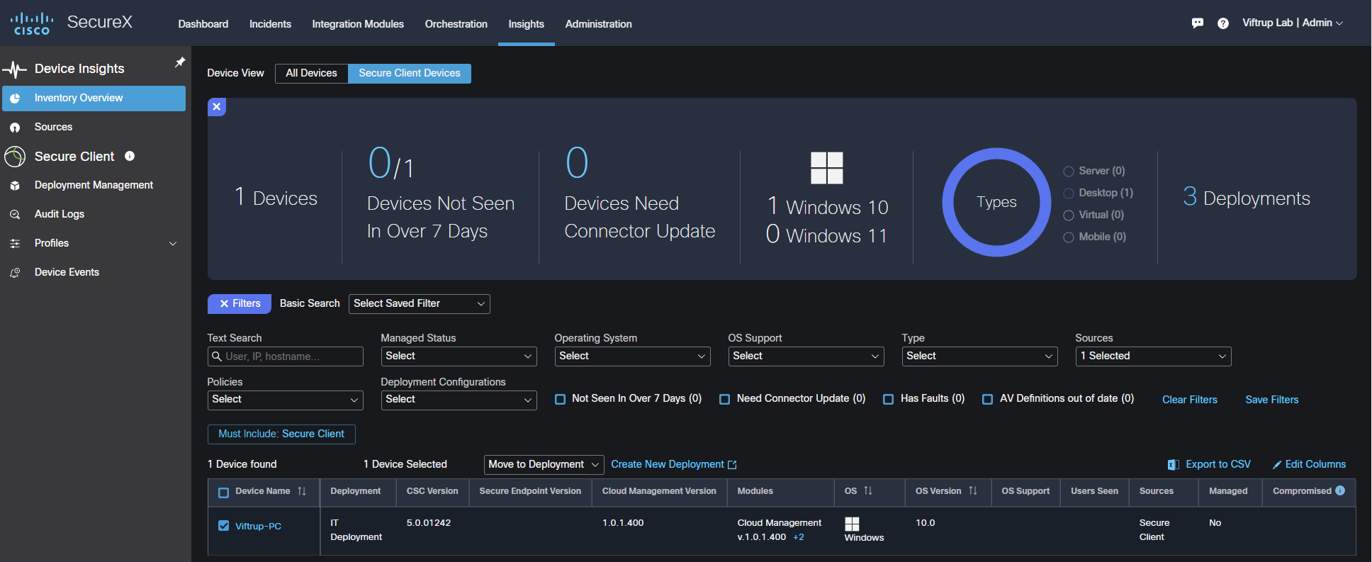 Once an endpoint has registered to SecureX through the CM module, it will be feeding data into the Device Insights tab about that specific endpoint and CSC attributes.